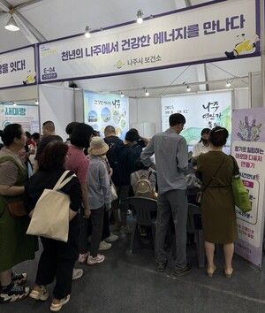 전라남도 나주시(시장 윤병태)는 지난 9월 26일부터 30일까지 5일간 장흥에서 개최된 ‘2025 대한민국통합의학박람회’에서 건강증진관 부스를 운영했다고 2일 밝혔다. 보건소 건강증진과는 ‘천년의 나주에서 건강한 에너지를 만나다’를 주제로 스트레스 지수 측정, 아로마 디퓨저 만들기, 나주 도라지배즙 시음, 건강증진사업 안내 등 다채로운 프로그램을 선보이며 관람객들의 발길을 끌었다. 특히 천연 아로마 향을 활용한 디퓨저 만들기와 나주의 대표 특산물인 도라지배즙 시음은 남녀노소 누구에게나 인기가 높아 나주 고유의 건강자원을 알리는 계기