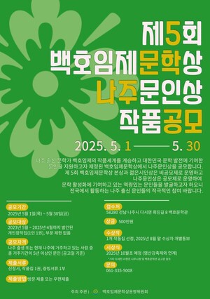 전라남도 나주시(시장 윤병태)는 제5회 백호임제문학상 나주문인상을 공모한다고 12일 밝혔다.나주 출신 문학가 백호임제의 작품세계를 계승하고 문학 발전에 기여한 문인을 지원하고자 제정된 나주문인상은 나주 출생 또는 현재 나주에 거주하고 있는 사람 중 총 거주기간이 5년 이상인 문인이라면 누구나 응모할 수 있다.2023년 5월부터 2025년 4월까지 발행한 개인창작집이 대상이고 시, 소설, 동화, 수필, 평론 등 장르와 관계없이 응모가 가능하다.기간은 5월 30일까지 작품집 1권, 신청서, 증빙서류 1부를 백호문학관 방문 또는 우편 제