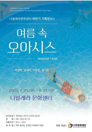 나주문화재단이 오는 7월 29일부터 8월 31일까지 나빌레라문화센터에서 하반기 첫 번째 기획전시 ‘여름 속 오아시스’를 개최하고 무더운 여름철 시민들에게 감각적 예술과 함께하는 특별한 휴식을 선사한다. 나주문화재단(이사장 윤병태)은 나빌레라문화센터에서 2025년 하반기 기획 전시 중 첫 번째로 ‘예술이 주는 쉼’을 주제로 구성해 기획전시를 진행한다고 28일 밝혔다. 회화와 설치 작품이 어우러진 공간 속에서 시원한 감각과 차분한 분위기를 통해 도심 속 여름 바캉스를 연상시키는 전시로 꾸며진다. 전시에는 총 4명의 작가가 참여해 각자의