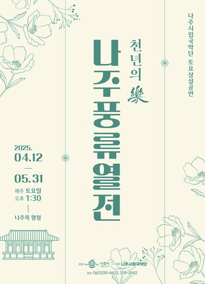 전라남도 나주시(시장 윤병태)는 나주시립국악단이 4월 12일부터 5월 31일까지 토요상설공연 ‘천년의 樂 나주풍류열전’을 개최한다고 9일 밝혔다.공연은 나주목 향청에서 매주 토요일 오후 1시 30분에 시작되며 누구나 무료로 관람할 수 있다. 전통예술을 즐길 수 있는 열린 무대로 시민은 물론 봄철 나주를 찾는 관광객들에게도 특별한 문화 향유의 시간을 선사할 것으로 기대된다.나주시립국악단의 토요상설공연은 2016년 첫 막을 올린 이래 매년 수많은 관람객의 발길을 이끌며 나주를 대표하는 전통예술 행사로 자리잡았다.특히 유서 깊은 나주 읍