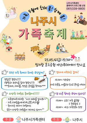 나주시가족센터는 5월 가정의 달을 맞아 가족의 화합을 도모하고 세대·문화 간 소통을 활성화하기 위해 나주시 가족축제 『가족, 5월에 친해 봄! 함께 봄! 2025 가족축제』를 오는 5월 16일 오후 3시 30분부터 나주 빛가람호수공원 야외무대에서 개최한다.이번 가족축제는 나주시가 주최하고 나주시가족센터가 주관하며, 나주시에 거주하는 가족을 대상으로 다양한 세대와 가족들이 함께 어울리며 즐길 수 있는 다채로운 프로그램으로 진행된다.행사는 오후 3시 30분 식전 공연(세계 전통 춤)을 시작으로 본식이 진행된다. 이후 2인 이상 가족이