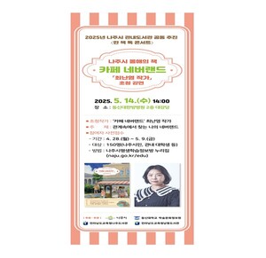 전라남도 나주시(시장 윤병태)는 2025 나주시 올해의 책에 ‘행운이 구르는 속도’, ‘달리는 강하다’, ‘카페 네버랜드’, ‘내면소통’을 선정하고, 이 중 ‘카페 네버랜드’ 최난영 작가를 초청해 ‘한 책 톡 콘서트’를 개최한다고 밝혔다.이번 콘서트는 오는 5월 14일 오후 2시 동신대학교 한방병원 대강당 2층(빛가람동)에서 개최되며, 나주시 평생학습정보방을 통해 선착순 150명을 모집한다.‘카페 네버랜드’ 한 책 톡 콘서트는 나주시 관내 도서관들이 공동으로 추진하는 행사로, 나주시 시립도서관, 동신대학술정보문화원, 전라남도교육청