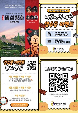 나주문화재단이 출범을 기념해 마련한 뮤지컬 ‘명성황후 갈라콘서트’ 영수증 이벤트 좌석을 200석에서 400석으로 확대했다. 문화재단은 오는 9월 13일 열리는 뮤지컬 ‘명성황후 갈라콘서트’와 연계해 지역 소비 촉진과 시민 참여 확대를 위해 영수증 이벤트를 진행하고 있다. 더 많은 시민에게 문화 향유의 기회를 제공하고 지역 상권 활성화에도 힘을 실으려고 이벤트 좌석을 늘렸다는 설명이다. 나주시민이 관내 상점 3곳 이상에서 15만 원 이상을 소비한 영수증을 제출하면 추첨을 통해 공연 A석 티켓 2매를 받을 수 있다. 행사 발표 직후 시