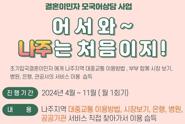 나주시가족센터는 한국 입국 1년 이하인 결혼이민자들을 위한 새로운 프로그램 "어서와~나주는 처음이지"를 시작한다. 이 프로그램은 2024년 4월부터 11월까지 총 8회기로 진행될 예정이며, 나주에 정착해 생활하고 있는 결혼이민자들에게 일상생활 정보를 제공하게 된다.