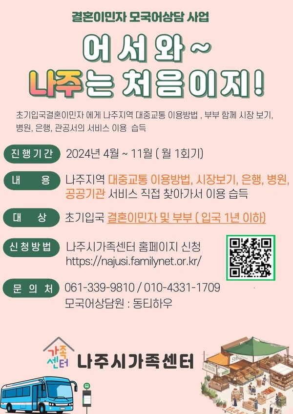 프로그램에 참여를 원하는 결혼이민자들은 나주시가족센터 전화(061-339-1709) 또는 방문하여 신청할 수 있다. 센터 프로그램 관련 자세한 사항은 센터 홈페이지(https://najusi.familynet.or.kr)를 통해 확인. 신청할 수 있다.