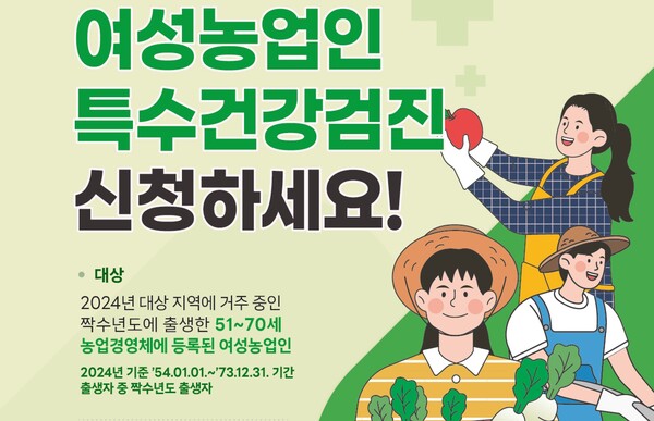 전라남도는 농림축산식품부의 여성 농업인 특수건강검진 사업 공모에 11개 시군이 선정돼 건강검진 희망자를 모집한다고 밝혔다. 이번 공모에는 전국 50개 시군, 여성 농업인 3만여 명이 선정됐으며, 이 중 전남도는 11개 시군, 6천600여 명으로 전국에서 가장 많은 여성 농업인이 혜택을 받게 됐다.