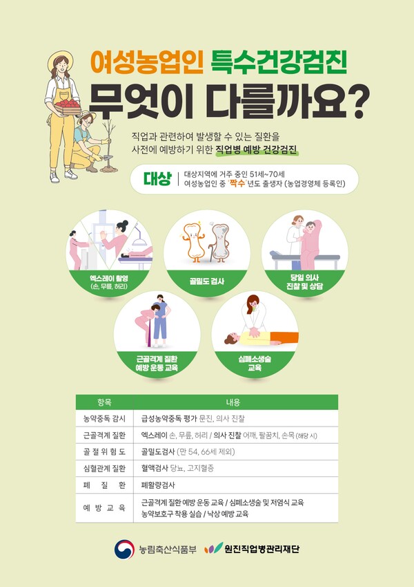 검진 항목은 여성 농업인의 농작업 질환 예방과 건강복지 증진을 위해 근골격계, 심혈관계, 골절·손상위험도, 폐활량, 농약 중독 등이다. 농작업 질병의 조기 진단과 함께 예방 교육, 전문의 상담도 실시한다.