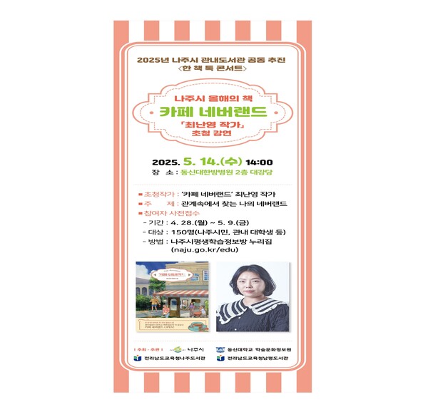 전라남도 나주시(시장 윤병태)는 2025 나주시 올해의 책에 ‘행운이 구르는 속도’, ‘달리는 강하다’, ‘카페 네버랜드’, ‘내면소통’을 선정하고, 이 중 ‘카페 네버랜드’ 최난영 작가를 초청해 ‘한 책 톡 콘서트’를 개최한다고 밝혔다.