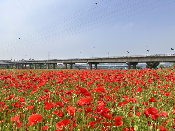 붉은색 꽃양귀비 물결이 장관을 이루는 전라남도 나주 영산강변에서 5월 가정의 달을 맞아 다채로운 축제 행사가 열린다.