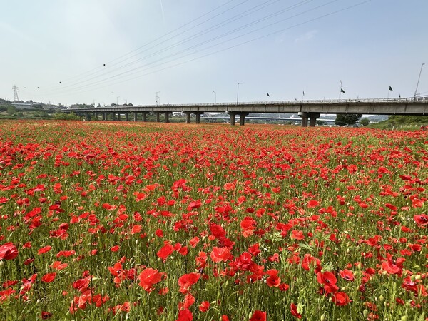 영산강 저류지 일대엔 싱그러운 봄바람에 물결치는 붉은색 꽃양귀비와 꽃 사이사이를 수놓은 하얀 안개초가 어우러지며 환상적인 풍경을 연출한다.