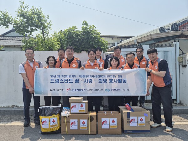 한국전력공사 나주지사 사회봉사단(지사장 송재근, 위원장 이정관)은 가정의 달을 맞아 5월 27일(화), 한전MCS 나주지점 봉사단(지점장 강소영)과 함께 ‘드림스타트 취약계층 봉사활동’을 공동으로 시행했다. 이번 활동은 나주시청 가족아동과의 협조를 통해 추천받은 취약계층 아동 가정 2세대를 대상으로, 맞춤형 지원과 안전한 주거환경 제공을 목표로 추진되었다.