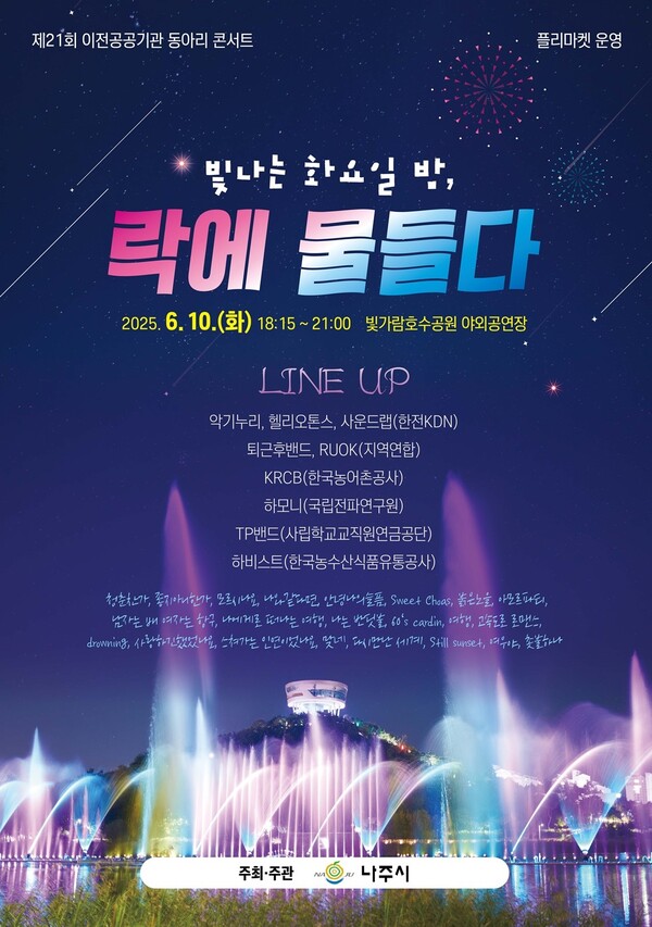 ‘빛나는 화요일 밤, 락에 물들다’를 주제로 열리는 이번 공연은, 빛가람 호수공원의 수려한 야경을 배경으로 혁신도시 이전 공공기관 및 지역연합 음악동아리 9개팀이 참여해 최신 K-팝부터 추억의 대중가요까지 다양한 장르의 음악을 선보일 예정이다.