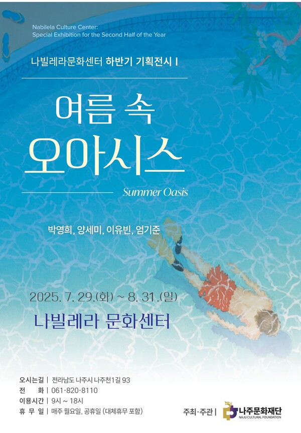 나주문화재단이 오는 7월 29일부터 8월 31일까지 나빌레라문화센터에서 하반기 첫 번째 기획전시 ‘여름 속 오아시스’를 개최하고 무더운 여름철 시민들에게 감각적 예술과 함께하는 특별한 휴식을 선사한다.
