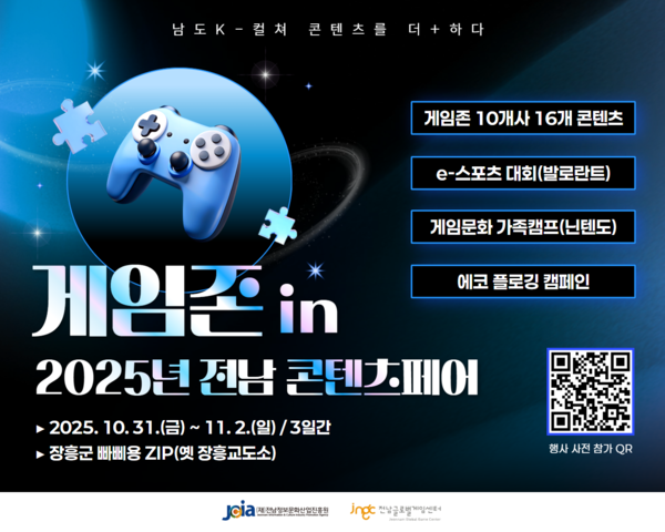 (재)전남정보문화산업진흥원(원장 이인용, 이하 ‘진흥원’)은 오는 10월 31일부터 11월 2일까지 장흥군 빠삐용.Zip(옛 장흥교도소 부지)에서 열리는 「2025 전남 콘텐츠페어」에서 전남글로벌게임센터와 연계한 다채로운 게임 프로그램을 운영한다고 밝혔다.