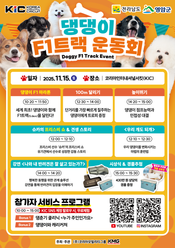 전라남도는 국제자동차경주장 관리운영을 맡은 ㈜코리아모빌리티그룹이 오는 15일 반려문화 확산을 위해 반려견과 함께 F1트랙을 달리는 ‘2025 댕댕이 F1트랙 운동회’를 개최한다고 밝혔다.