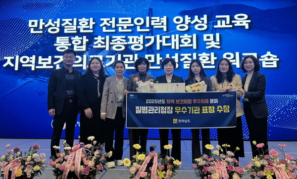 전라남도는 19일까지 이틀간 여수 디오션리조트에서 개최된 2025 만성질환 전문인력 양성교육 통합 최종 평가대회에서 지역 보건사업 우수사례 분야 우수기관으로 선정됐다고 밝혔다.