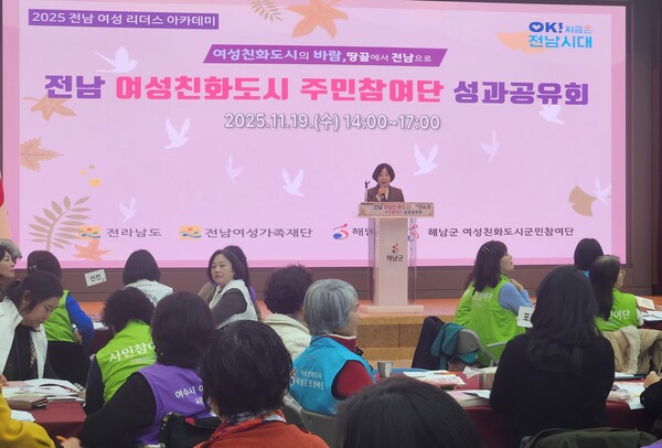 전라남도는 2025년 전남여성친화도시 주민참여단 성과공유회를 지난 19일 해남문화예술회관에서 개최, 9개 여성친화도시 시군민 주민참여단과 ‘모두가 평등하고 안전한, 살기 좋은 전남’ 만들기 방안을 논의했다.